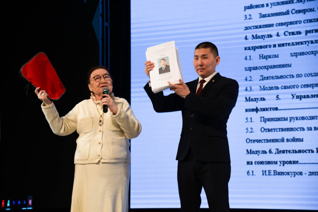 Мунньах ыҥырыылаах ыалдьыта, социология билимин доктора, профессор, “Эҥсиэли хочотун култуурнай кода” айар бөлөх салайааччыта Ульяна Алексеевна Винокурова Нам улууһа Саха сирин ААН УЛУУҺА буоларын өссө төгүл тоһоҕолоон эттэ уонна саҥа тахсыбыт “И.Е.Винокуров — менеджер кризисного типа” диэн 543 страницалаах үөрэх пособиетын, “Культурный код долины Энсиэли” научнай түмүктэрдээх отчуоту Егор Андреевич Протопоповка туттарда. Саҥа тахсыбыт пособие бүтүн дойду үрдүнэн киэҥник биллэр биир дойдулаахпыт, бөдөҥ салайааччы, судаарыстыбаннай диэйэтэл Илья Егорович Винокуров 130 сылыгар түбэһэ Намнарга туттарыллыбыта быйылгы бэлиэ сыл сүдү суолтатын күүһүртэ.